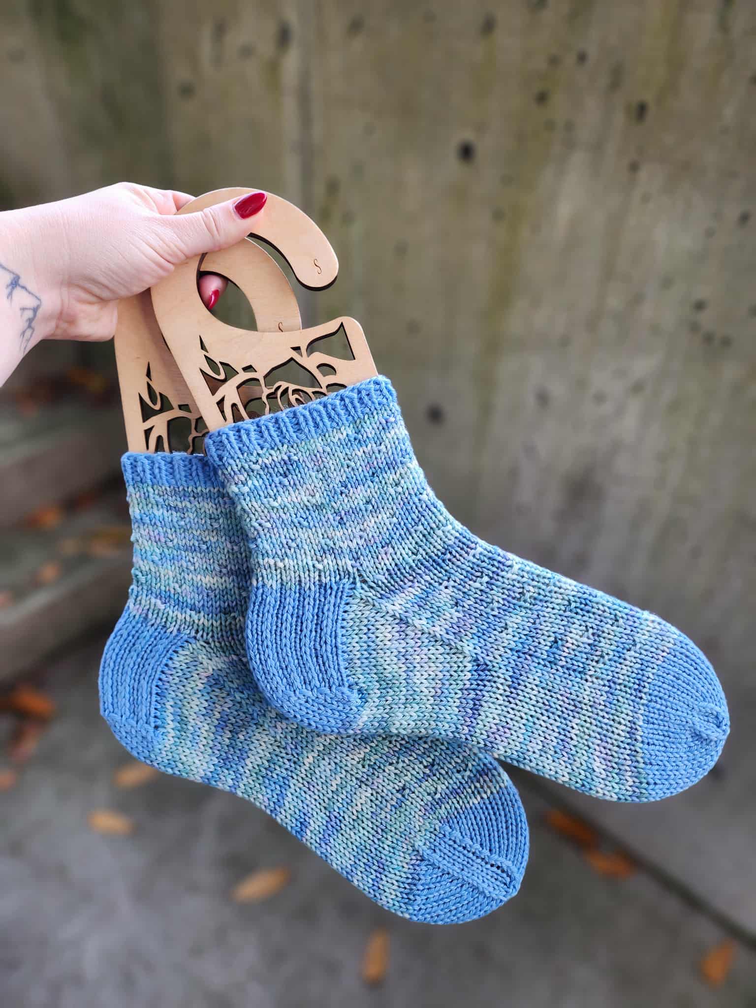 This design is intended to be worked with DK yarn (you could also use fingering weight yarn held double). The pattern is designed with a DK sock set, with the main body of the sock knit in the variegated full skein Main Colour (MC), and the cuffs, heel and toes knit in the tonal mini Contrast Colour (CC).