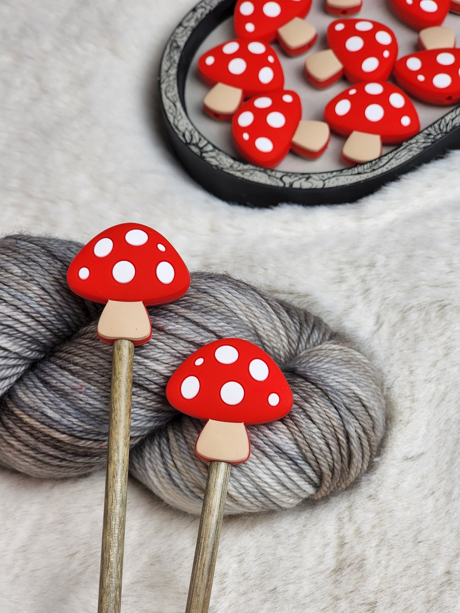 Add these cute mushroom stitch stoppers/needle minders to the tips of your needles to keep your knitting from slipping off the ends!