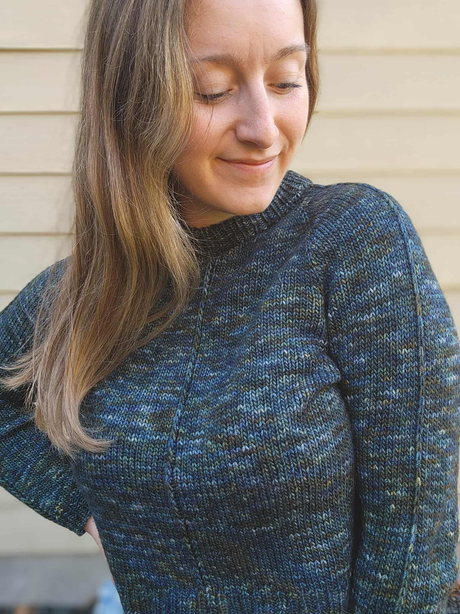 Sample is knit using Treehouse Knits Dove DK (246 yds/100g) in the colourway I Live in Two Worlds.
