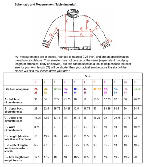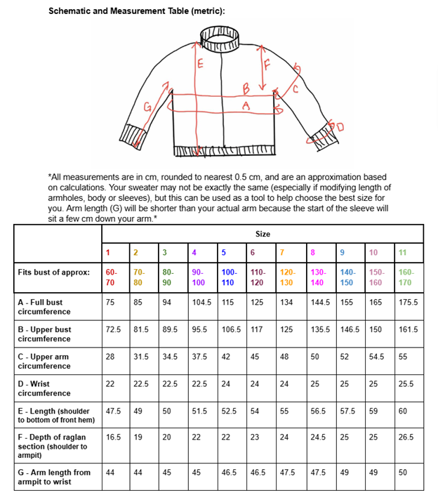 Note: The sizes reflect the FINISHED bust measurements in inches / cm of the sweater, and listed below you can see the recommended actual bust range for each size. The sweater is designed for 2-6 inches / 5-15 cm of positive ease. To determine the size you wish to knit, measure your bust and add 2-6 inches / 5-15 cm to find the closest size. If you have a large difference between upper and full bust, you may wish to choose size based on upper bust, as the additional increases to the full bust measurement are easily adjustable. My sample is knit with about 2 inches / 5 cm of positive ease (Size 3 on a 36 inch / 90 cm bust and 30 inch / 75 cm waist).