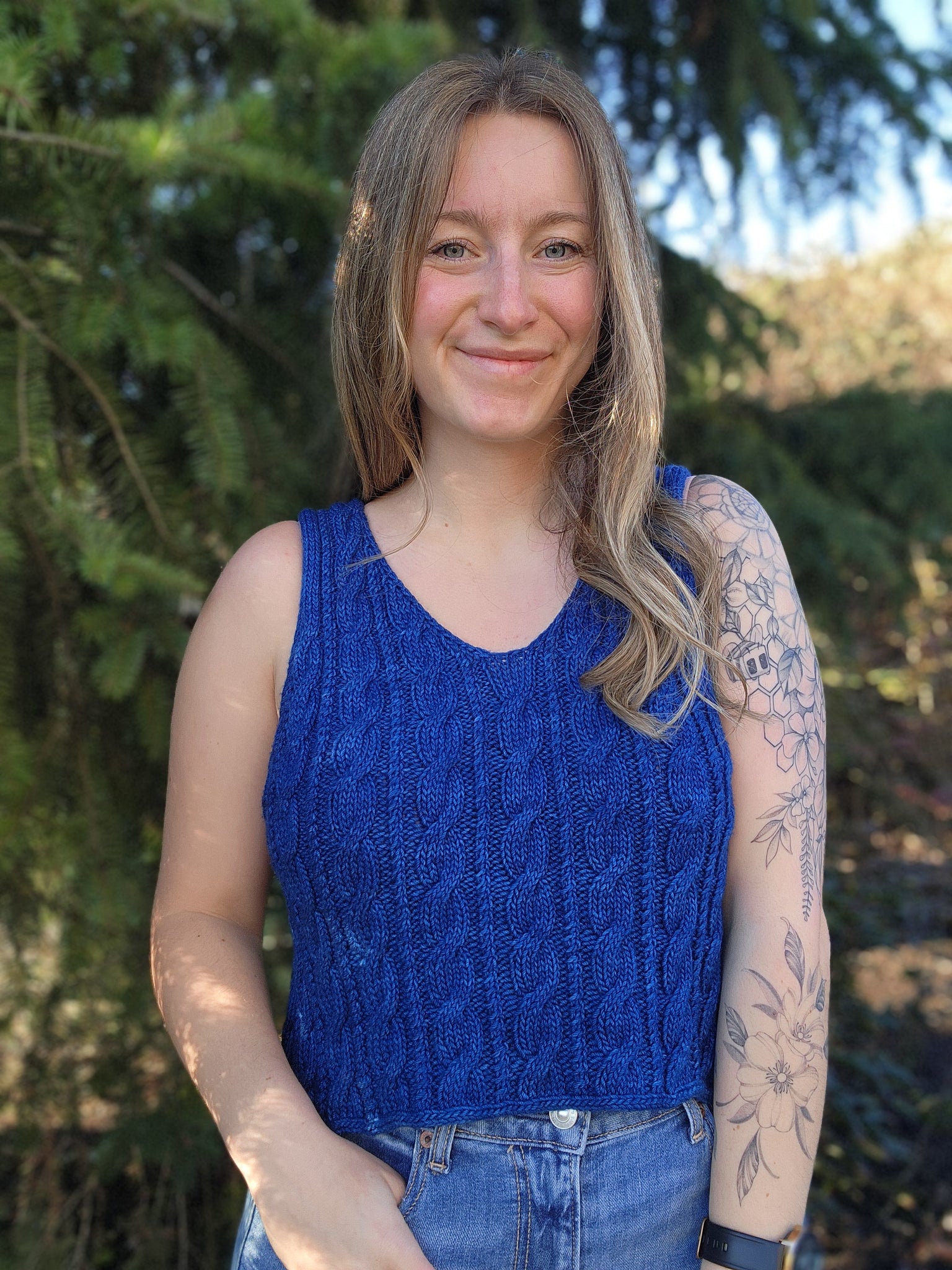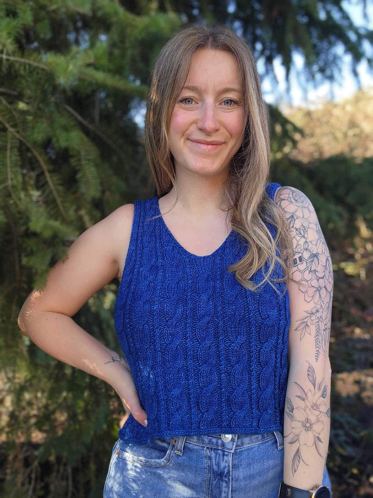 The Entwined Destinies Vest is a cute V-neck cabled vest. It is worked top down, flat for the armhole shaping, then in the round for the remainder of the body. The edges are worked with an I-cord/selvedge edge. The vest is worked to an upper bust measurement during the armhole shaping section, and then some additional increases are worked during the beginning of the body section to reach full bust measurements. The vest is designed to fall to a cropped/high waist level and is intended to be a slightly oversized, boxy fit, but has options for a small amount of waist shaping if desired, as well as adding extra length as needed for the body. This is a size inclusive design, written for 10 sizes (32-68 inch / 80-170 cm finished bust, in 4 inch / 10 cm increments) and designed for 2-6 inches / 5-15 cm of positive ease.